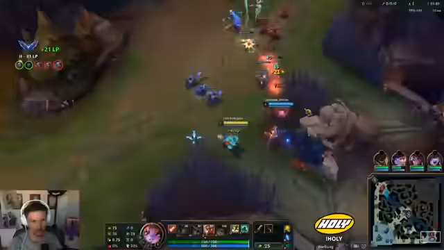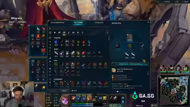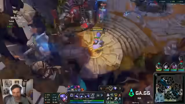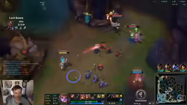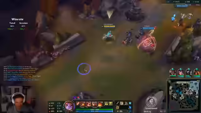 00:49:06Für das zweite Spiel wird der Champion gewechselt und Kindred im Jungle gewählt. Der Item-Build basiert auf Triforce und Collector. Das Early gestaltet sich jedoch desaströs. Ein Gegnerin mischt den Jungle, was dem Streamer das Grub-Camp und wertvolle Zeit kostet. Er fühlt sich komplett im Arsch und muss die Rolle des Psychopathen spielen, um den eigenen Jungle zu farmen. Seine Ineffizienz wird selbstkritisch analysiert und der Gegner-Kayn, der durch Invasionen ebenfalls behindert ist, wird als Psycho beschrieben. Die mangelnde Kommunikation im Team wird als problematisch empfunden.