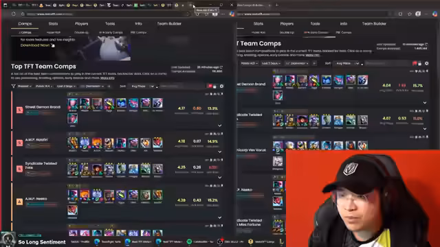 03:15:37Die Zukunft der Meta-Analyse wird diskutiert. Der Streamer erklärt seinen Prozess: Er sammelt zunächst alle verfügbaren Informationen aus verschiedenen Patch-Rundowns, um dann seine eigene Einschätzung abzugeben. Er prognostiziert, dass seine erste Meta-Analyse am ersten Tag bereits zu etwa 70% Genauigkeit erreicht und im Laufe der Woche auf 90-95% steigt. Er präferiert intensives Research vor dem Spiel, da dies eine höhere Erfolgswahrscheinlichkeit in 'Top 4'-Spielen verspricht, auch wenn er den Gameplay-Wunsch des Publikums versteht und befolgen wird.