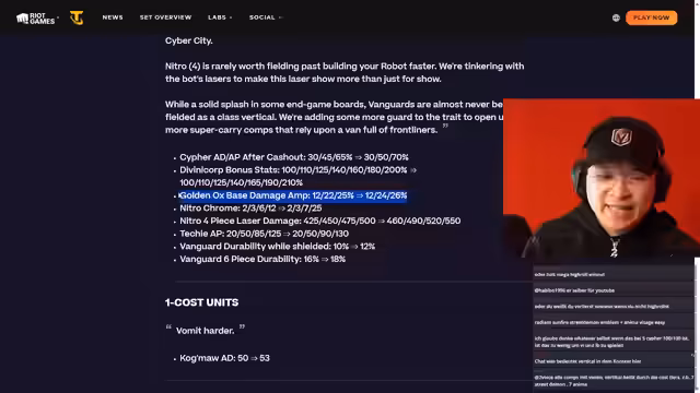 01:23:47Basierend auf den Patch-Notes gibt der Streamer seine Prognose für das neue Meta. Er erwartet, dass die gebufften Champions wie Renekton und Zed aufgrund der gleichzeitigigen Nerven ihrer Hauptkonkurrenten deutlich stärker werden. Golden Ox wird ebenfalls profitieren, da die stärksten Gegner-Comps geschwächt wurden. Er sieht besonders viel Potenzial in der Kombination aus Nitro mit dem Moonlight-Augment, da dies den spielerischen Aufwand für den Erhalt starker 4-Star-Einheiten drastisch reduziert und das Tempo im Spiel erhöht.