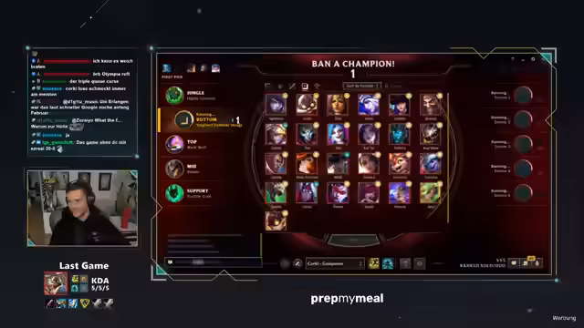 00:01:15Der Stream beginnt mit der Absicht, ein entspanntes Game zu spielen und einen Win mit Corki zu holen. Dieser Plan wird jedoch durchkreuzt, als stattdessen Ezreal als Champion ausgewählt wird, obwohl der Streamer sich als zertifizierter Ezreal-Hater bezeichnet und sich über den unausgeschlafenen Zustand seines Körperzustands beschwert. Es wird entschieden, Ezreal trotzdem zu praktizieren und den Lane-Fokus auf die Azur-Lane zu legen, da diese als besonders wichtig erachtet wird.
