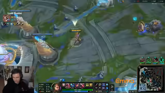 01:30:27Das Spiel entwickelt sich in eine Phase, in der der Streamer durch den Champion Ezreal frustriert ist. Er trifft seine Skillshots nicht konsequent, was seinen Schaden drastisch reduziert, obwohl er drei Items besitzt. Die Entscheidung für ein viertes Item fällt schwer, da man ein "Jack of all trades proc" benötigt. Das Gefühl, trotz Items useless zu sein, führt zu Frustration, da man eine Stufe über OTP sein muss, um gut zu spielen.