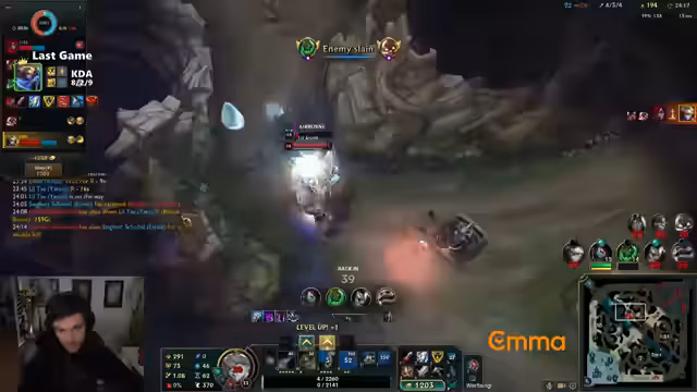 00:07:42Die Bot-Lane gestaltet sich als äußerst intensives und forderndes Matchup gegen einen starken Gegner wie Warlords Nico. Es gibt Diskussionen über das Elo-Niveau der Gegner und der eigenen Mitspieler. Der Streamer bemerkt, dass er in den letzten Spielen schlecht performt, sobald er im Discord mit anderen Personen redet, und spekuliert, dass seine Performance ohne Voice-Kommunikation besser wäre. Es kommt zu einem Tod, der als "geisteskrank" beschrieben wird.