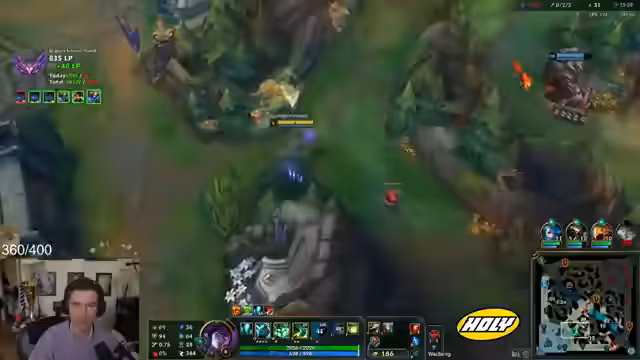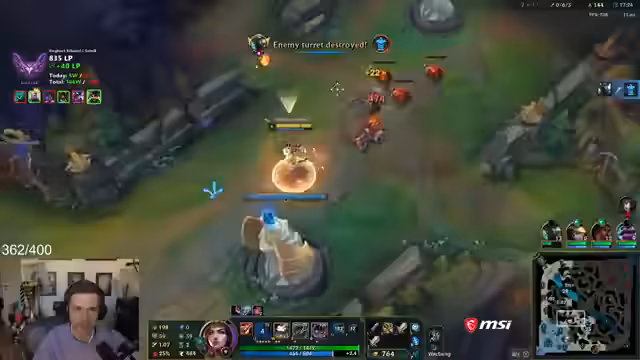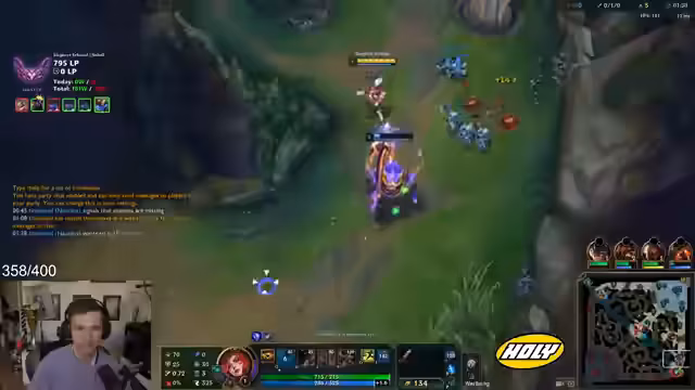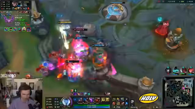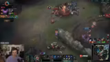 01:32:58Ein frustrierendes Game, bei dem der Streamer gegen sein eigenes Team und das gegnerische Team spielt. Er ist unfähig, aus seiner Position herauszukommen, und muss alleine Waves annehmen, was ihn schnell runterzieht. Die Kaiserspieler wird als unspielbar beschrieben, wobei theoretisch ein Rel-Ult und ein Flash-Engage auf die Kaiser das Game entscheiden könnten. Beautiful engage wird gerufen, als es gelingt, die Kaiser zu killen und einen Break zu bekommen.