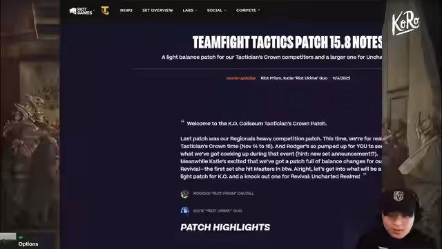 00:07:43Der Streamer beginnt mit der Diskussion über den neuen Patch 15.8, der live gegangen ist. Er erwähnt, dass er Riftbound bereits in Macau gespielt hat und die Starterdecks besitzt. Anschließend geht er auf die Patch Notes für TFT ein, die als Vorbereitung für die TFT Weltmeisterschaft dienen. Diese Weltmeisterschaft findet vom 14. bis 16. November in Alicante, Spanien, statt, wo der Streamer auch live vor Ort sein wird, um zu casten und Interviews zu führen. Er geht auf die Buffs und Nerfs von Champions und Augments ein, darunter Kaiser, Rammus, Javan, Healing Orbs, Tentacle Smash, Crystal Gambit, Katarina, V-Roll, Lee Sin, Juggernaut, Legendary Combs, Raid Boss, Bastion, Legendary Combs, Shen, Raiding Kraken, Twisted Fate, Ash und Jinx. Auch Call to Chaos, Star Student und Star Sailor wurden angepasst. Jinx und Warwick kehren in den rotierenden Shop zurück, während Caitlin und Vi hinzugefügt werden. Es wird auch über die Möglichkeit gesprochen, dass Set 16 am 18. November auf den PBE-Server kommt.