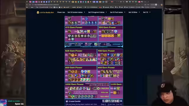 03:02:04Der Streamer korrigiert das Veröffentlichungsdatum des Testservers für Set 16 auf den 18. November, nachdem Riot Games die Community mit dem 5. November geködert hatte. Er plant, 'Edge of Night' und 'Tankzilla' zu bauen und ist zuversichtlich, die Kontrolle zu behalten. Er bestätigt, dass 'Crystal Gambit' immer noch spielbar ist, obwohl es leicht generft wurde, da weniger Spieler diese Komposition spielen. Er überlegt, Samira mit 'Shojin', 'Infinity Edge' und 'Gunblade' zu spielen und 'Kraken' mit 'Edge of Night' zu kombinieren. Er hat viele Power Removers und überlegt, wie er seine Items am besten einsetzt.
