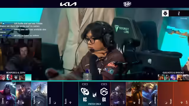 00:00:00Nach erheblicher Verspätung, verursacht durch Schneefälle in Berlin, beginnt der Stream mit dem Start des Spiels G2 gegen Team Heretics. Kommentator sola analysiert die Drafts: G2 wählte Caitlyn, Bard, Ryze, Vi und Gwen. Heretics reagierte mit Mundo, Anivia, Aphelios, Pyke und Sion. Der Pyke-Pick wird als ungewöhnliche und aggressive Wahl bezeichnet, während Gwen und Ryze als starke Spätspieler mit hohem Skalierungspotenzial gegen die Tank-Kombo Sion/Mundo gesehen werden. Kommentiert wird auch die Abwesenheit von Caitlyn im offiziellen DC-Stream.