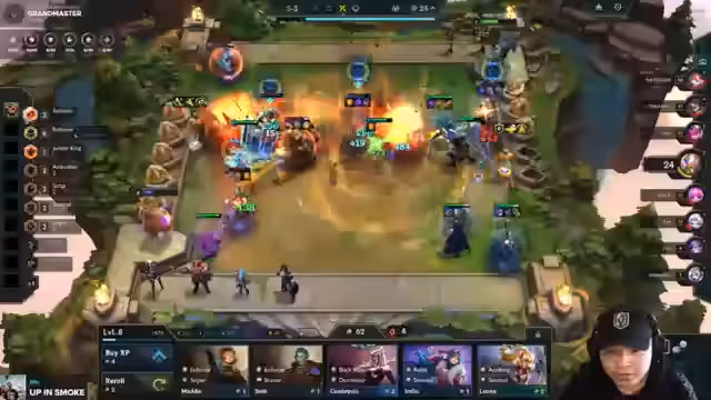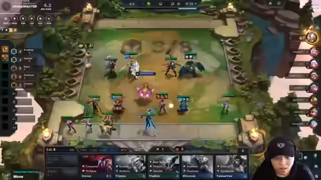 01:30:07Der Streamer beginnt ein neues Spiel und beschwert sich über häufiges Zögern bei der Rollphase, obwohl er seinen Plan bereits kennt. Er befindet sich auf Level 8 mit nur 100 Gold und hat bereits ein erstes Augment ausgewählt. Er analysiert, dass bei sofortigem Rollen in Stage 4,2 wahrscheinlich eine Top-2-Platzierung möglich gewesen wäre. Er bemängelt, dass zu viele goldene Einheiten gesammelt wurden, was eine optimale Rollstrategie verhindert hat, und spekuliert über den Verlust des Spiels.