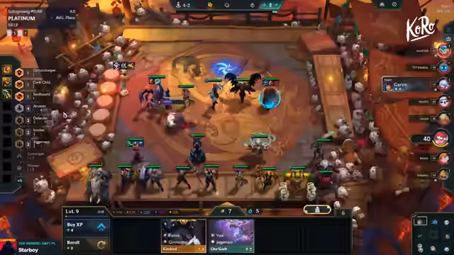 09:17:37Ein zentraler Kampf steht an, in dem der Streamer seine Carries ordentlich platzieren muss, um Schaden zu vermeiden. Sein Team wird als stark genug für einen Ersten Platz angesehen. Er plant, Level 9 zu pushen und sucht die passenden Einheiten wie Feastor und Fiendzweißlegal, um das Team zu vervollständigen. Die Erwähnung von Kristalle Mafia zeigt, dass auch alternative, spätere Carries wie Nasus oder Renekton als Optionen im Kopf sind.