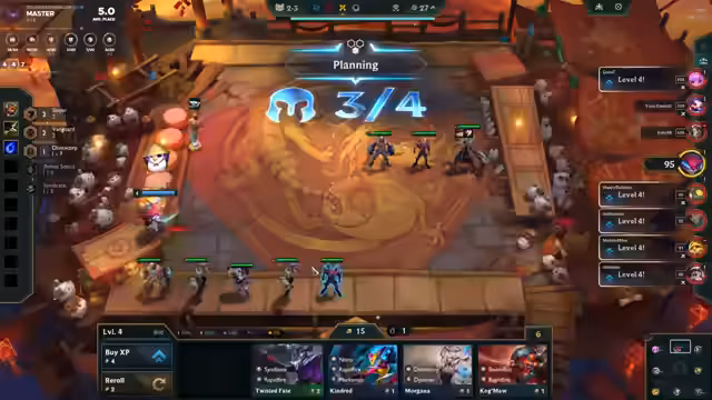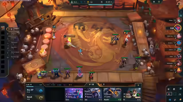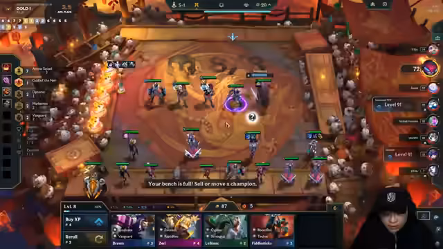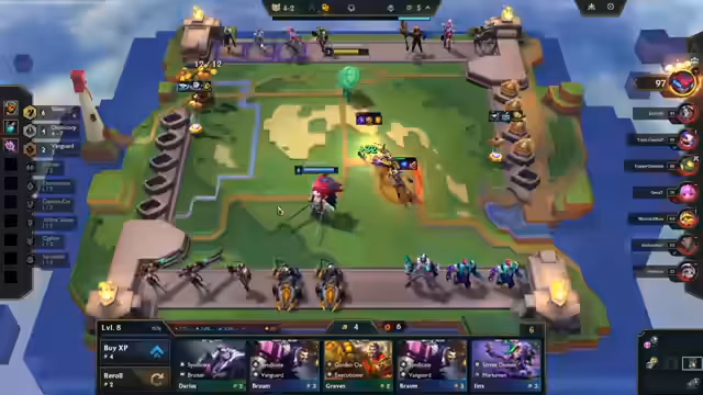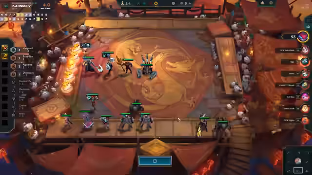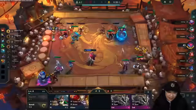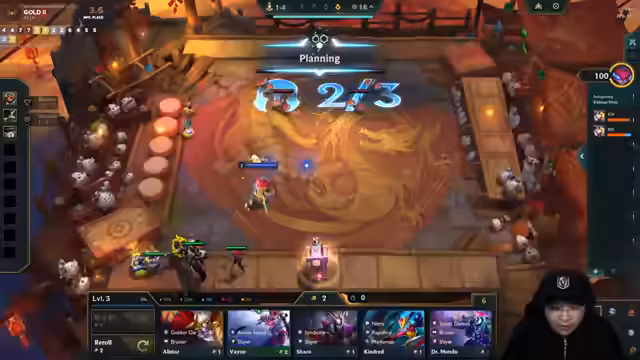 Nachdem das Gold knapp wird und eine Niederlage droht, wird das Board neu aufgebaut. Rengar wird als primäre Schadenseinheit fokussiert und strategisch positioniert, um die gegnerische Backline zu eliminieren. Der Streamer entscheidet sich für den Aufbau von Street Demon, nutzt jedoch nur die entscheidenden Felder, um Köder zu vermeiden. Das Ziel ist es, durch Siege wieder Gold zu farmen und ins Late Game zu kommen.