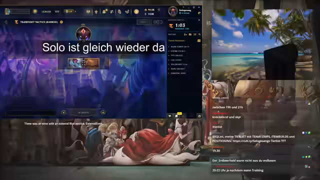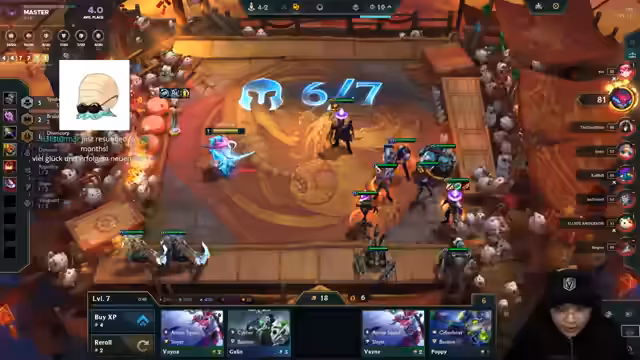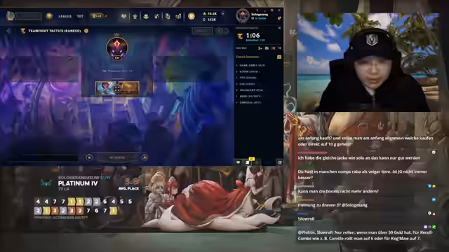 17:02:39Der Streamer beginnt den Stream und diskutiert über seine Champions und Items. Er überlegt, Marksman zu spielen, ist aber unsicher, da er andere Champion-Optionen wie Dynamo oder Dings in Betracht zieht. Er analysiert die Stärke verschiedener Champions, insbesondere Bob und Vom, die er als sehr stark bezeichnet. Der Streamer experimentiert mit Champion-Swaps, wie Leona für Seraphine, und überlegt, die Reihenfolge seiner Champions zu optimieren, um eine gute Platzierung zu erzielen.