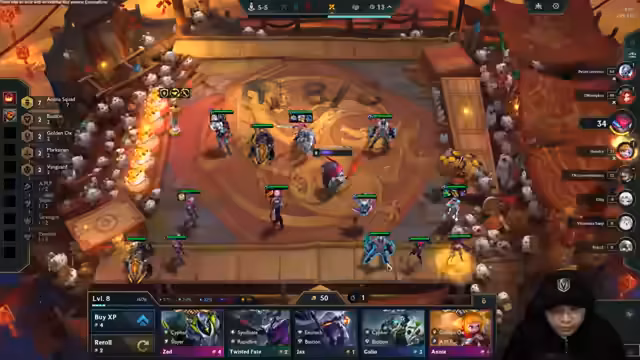 Die späte Spielphase konzentriert sich auf den Aufbau einer Bruiser-Golden-Ox-Anima-Squad-Kombo. Der Streamer priorisiert Items wie Cloak, Hurricane und Shoujin für den Carry Draven. Er entscheidet sich, einen Jinx-Build auszutesten, obwohl er nicht optimal ist. Das Ziel ist es, eine Streak zu erzeugen, um genug Gold für den Aufstieg auf Level 8 zu sammeln. Die Konzentration liegt auf Wirtschaft und der Vorbereitung für das Endgame.