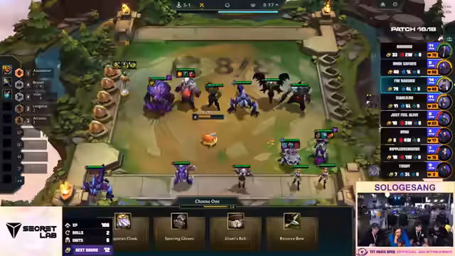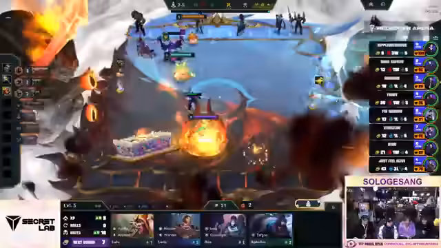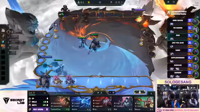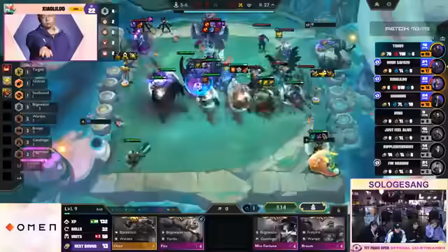 01:55:42Das Showmatch geht in seine heiße Endphase. Viele Spieler haben auf Level 8 oder 10 erreicht und suchen nach 3-Star Einheiten, um eine Siegchance zu wahren. Ein spannender Moment ist der Versuch von Spieler Revan, einen 'Baron 3' zu bauen. Leider stirbt seine gesamte Board durch einen Encounter, der ihn zwingt, von vorne zu beginnen. Trotzdem ist das Spiel sehr unterhaltsam und zeigt die hohen APM der Finalisten und die wilden und unberechenbaren Taktiken des Chaos-Carousel-Modus.