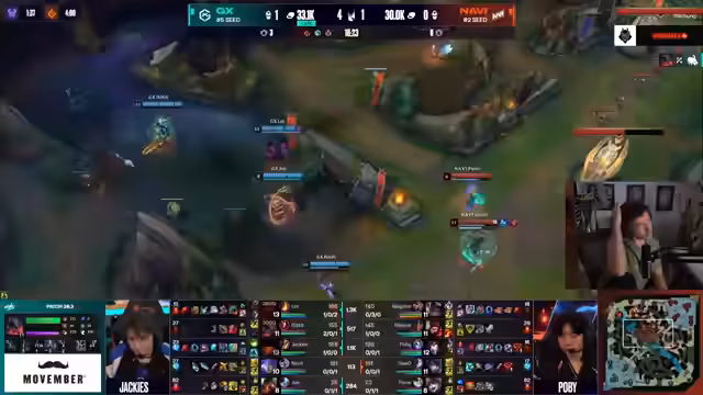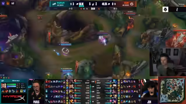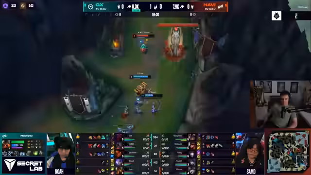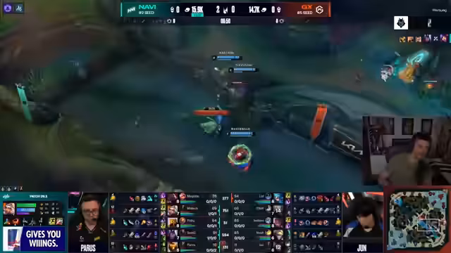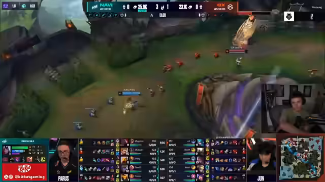 02:28:56Im Verlauf des zweiten Spiels werden vermehrt Fehler in der Teamkommunikation und taktischen Entscheidungen von Navi angesprochen. Ein zentraler Kritikpunkt ist ein misslungenes Play, bei dem sich Spieler in einer 4-gegen-5-Situation zurückziehen, anstatt den gegnerischen Baron Nashor zu kontestieren, was als strategischer Fehler gewertet wird. Weitere Fehlentscheidungen, darunter ein gefährliches Facecheck von Rilek, führen zu einem rapiden Goldvorteil für GiantX und stellen die Navi-Spieler unter zunehmenden Druck. Die Chat-Kommentare spiegeln die Verwirrung über die fehlende Abstimmung wider.