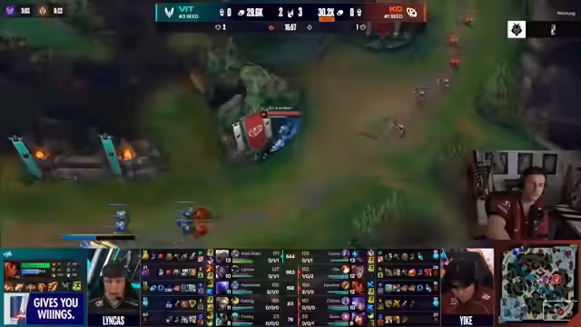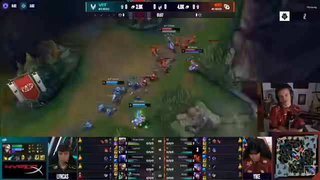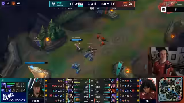 04:01:55Das Early Game zwischen den Bot-Lanes wird als knappes Skill-Matchup beschrieben, bei dem beide Seiten ihr Potenzial zeigen. KC gewinnt den First Blood mit einemKyle-Recoil gegen einen Tryndamere-Recoil. Der Jungler Yike von KC übernimmt früh die Kontrolle über das Spiel und bestraft gegnerische Fehler hart. Mit einem Solo-Kill am Turm erobert er den Drachen und den Graben, was zu einem signifikanten Goldvorteil für KC führt. Sein Eingreifen wird als wachsam und bestrafend beschrieben, während es für Vitality Desasterhaft wirkt.