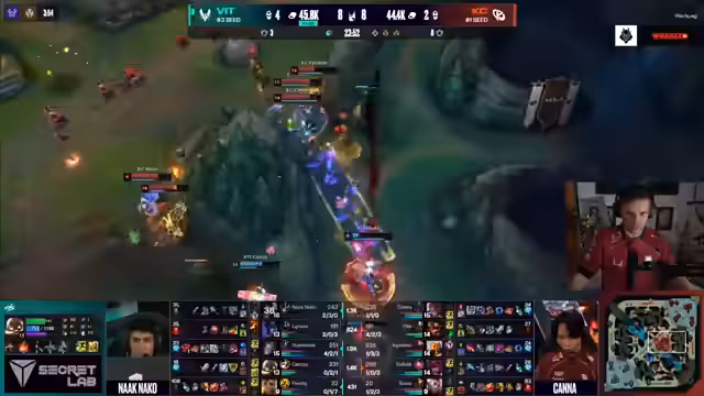 04:21:16KC verliert den dritten Drake, da Vitalitys Ezreal zu früh die Position verlässt und flasht. Vitalitys Kanna macht in diesem Bereich einen Fehler und stirbt in einem riskanten Redemption-Einsatz, was ein teurer Fehlschlag ist. Ein weiterer Kampf bricht aus, bei dem Vitalitys Ultimatums auf Koldown stehen, was zu einem Desaster führt. Kalis Positionierung ist schlecht, und er läuft direkt in den Feind, was den Kampf für KC zu einem klaren Sieg für Vitality macht.