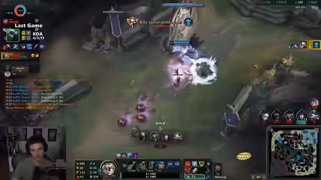 03:17:31Nach einem gewonnenen Teamfight, der mit einem Kill von SamD endet, wird die Frage nach der Effektivität der eingesetzten Ultimate-Skills und Teleporte diskutiert. Der Streamer analysiert die verbrauchten Ressourcen und stellt fest, dass Navi stark von ihren Ultimate-Abhängigkeiten und den zugehörigen langen Cooldowns geprägt ist, was sie ohne Ultimativen handlungsunfähig mache. Gleichzeitig wird der Champion Giant X mit einer persönlichen Antipathie betrachtet, wobei die genauen Gründe dafür nicht genannt werden. Die Item-Builds, insbesondere Riedachs, werden hinterfragt und ihre Wirksamkeit gegen gegnerische Schilde wie von Thalia Serpensfang in Zweifel gezogen. Die Fähigkeit von Infernal Soul, das Spiel zu beeinflussen, wird ebenfalls als Thema erwähnt.