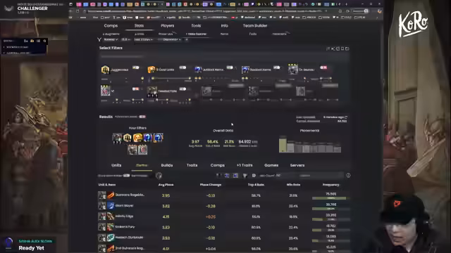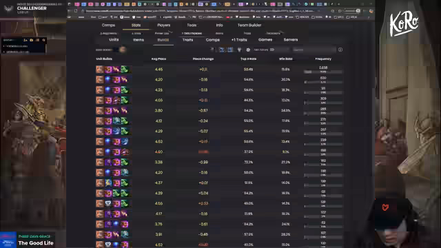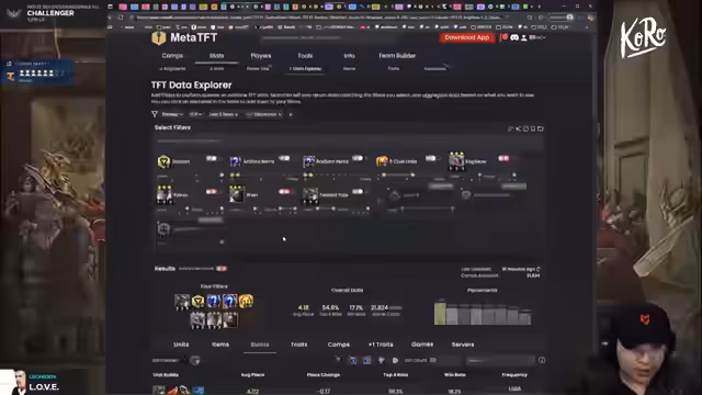 01:01:26Im Scrimblock wird Golden Gala getestet, was schwierigere Level-9-Pushes bedeutet. Daher werden mehr Reroll-Comps wie Ahri-Bastion oder Volibear priorisiert. Spezifische Builds werden besprochen: Für Seraphine sind zwei Mana-Items essenziell, Twisted Fate profitiert von Rageblade/Giant Slayer. Legendary Comps erfordern Übung, besonders Crystal Gambit für Cashouts und frühes Level 8/9. Der Streamer betont, dass Level-9-Pushing der schwierigste Playstyle ist, den man gezielt üben muss.