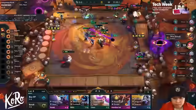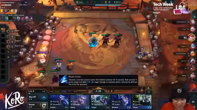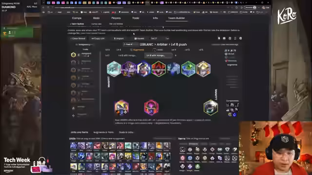 00:09:14Der Stream beginnt mit einer Begrüßung des Chats und technischen Vorbereitungen. Der Streamer prüft die Keraschärfe und richtet seinen Arbeitsplatz ein. Es werden erste Taktiken für das Spiel besprochen und ein Überblick über die aktuelle Meta gegeben, einschließlich Stargazer-Einheiten und bevorstehender Patches.