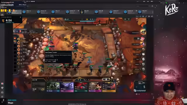 05:28:11Im späteren Spielabschnitt konzentriert sich der Streamer darauf, schnell auf Level 9 zu kommen und das Noxus-Team mit Shen und anderen Einheiten aufzubauen. Er behält Nauto behält, um eine starke Frontline zu haben. Das Ziel ist, TX freizuschalten und einen Item-Drop wie Scanner zu erhalten. Er analysiert die Boards der Gegner und bewertet, wer als der stärkste Gegner gilt, um seine Chancen auf den Sieg richtig einzuschätzen.