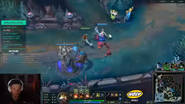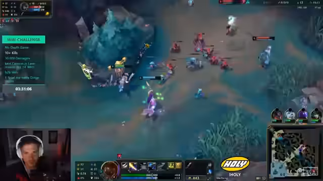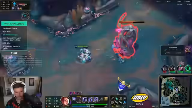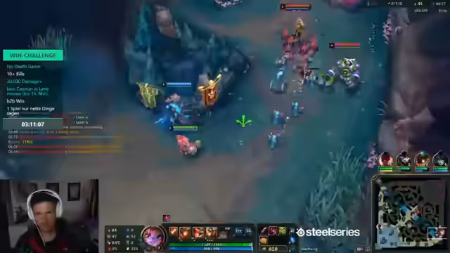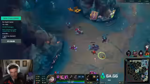 00:02:16Das erste Spiel beginnt, wobei der Streamer Lucian als AD-Carry und Elise als Support gegen Corki und Nami spielt. Trotz eines ansprechenden Starts gerät die Partie ins Wanken. Der Jungler des eigenen Teams agiert unausgeglichen und der Streamer stirbt in einem Teamfight. Zwar gelingt es ihm, die Herausforderung von 30.000 Schaden im Spiel zu erfüllen, aber das Scheitern an der No-Death- und der 10-Kills-Herausforderung ist damit besiegelt. Der Versuch, das gesamte Spiel auf Deutsch zu kommentieren, wird nach kurzer Zeit aufgegeben, da der Streamer feststellt, dass dies bei der Fokussierung auf das Spiel unmöglich ist und ständig englische Begriffe rausrutschen.