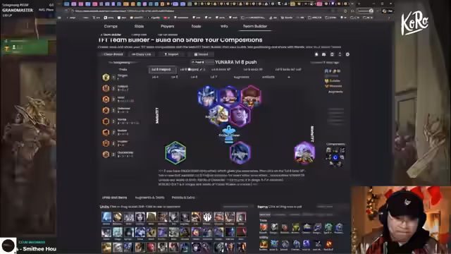 00:55:12Yunara wird auf Level 8 mit Standard-Board gespielt, auf Level 9 mit Ryze 2 aufgewertet. Französisches Positionierungsmuster: Yunara in der Ecke, um Buffs zu maximieren und gegen Diana-Positionierung zu schützen (Diana läuft vor und ultet falsche Ziele). Variante mit Sylas statt Jin/Xin Zhao möglich. AD-Start (Jhin, Aphelos) wird benötigt.