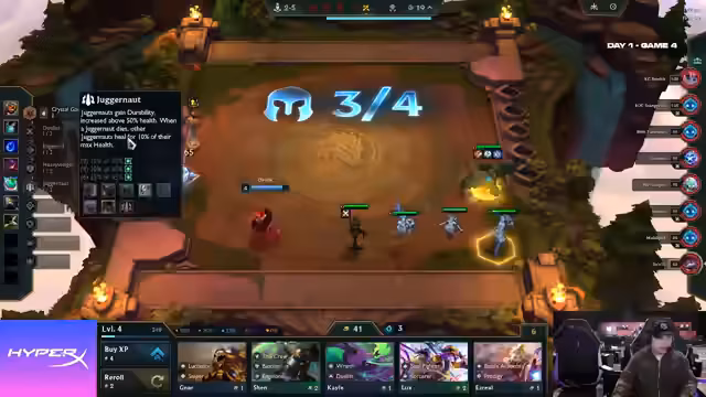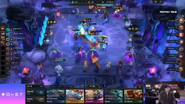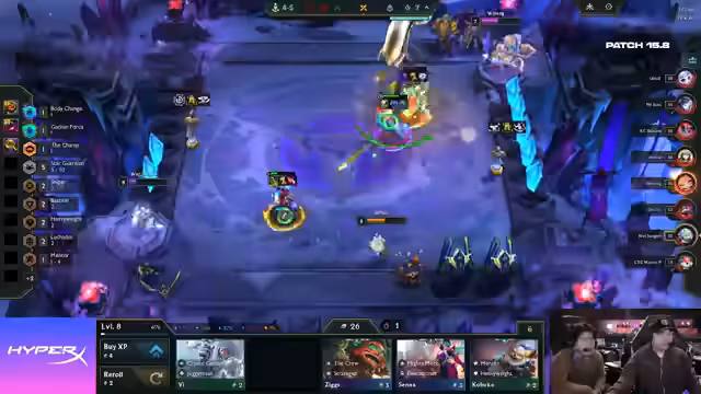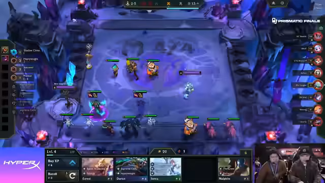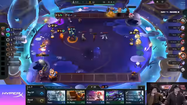 01:51:54In der späten Spielphase von WetJunglers Match werden kritische Entscheidungen getroffen. Obwohl Double mit Star Guardian und AP-Items spielt, könnte er auf Legendaries setzen, während Jinx/Seraphine als Dual-Carry-Option für WetJungler in Betracht gezogen wird. Marcel setzt auf Crystal Gambit, um einen großen Cashout zu erzielen. Ketux spielt Samira/Volibear, eine beliebte chinesische Comp, die durch eine Luchador Spatula im Mid-Game konsistent ist. Ciel mit 'Routing for Days' und 'Ticket' hat Schwierigkeiten, einen Twisted Fate zu finden, der potenziell von Marcel umkämpft wird. WetJungler slammt 'Vintage' und spielt wahrscheinlich Jinx, hat aber wenig Gold und Leben. Er casht 250 Gold, was als bewusste Entscheidung für mehr Econ statt Items interpretiert wird. Er schafft es, seine Double-Down-Streak zu erhalten, während er die seiner Gegner denied. Im deutschen Duell verliert WetJungler gegen DeHua und fällt auf ein Leben. Die Jinx 2 wird gefunden, was das Board stabilisiert, aber die geringe Lebenspunkte-Anzahl bleibt ein Risiko. Die Diskussion dreht sich darum, ob ein Braum gefunden werden kann, um Leben zurückzugewinnen, und ob das Star Guardian Emblem auf Volibear transferiert werden sollte, um drei Items auf einer Einheit zu haben. Die Frage, ob auf Level 9 gepusht oder gerollt werden soll, wird ebenfalls erörtert, wobei Level 9 als die bessere Option angesehen wird, um die Syndra mitzunehmen.