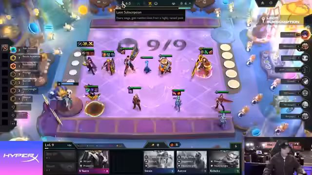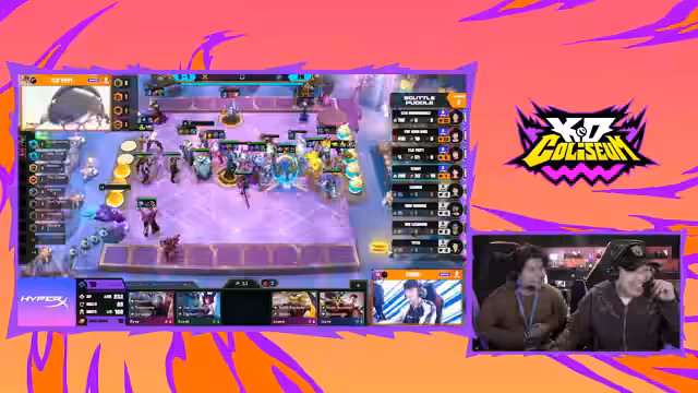01:38:10Im weiteren Verlauf des Spiels treten mehrere Spieler in einen Double-Down-Modus, um das Potenzial der Loot-Region maximieren zu können. Jungler trifft eine riskante Entscheidung, indem er statt eines 300-Golds ein 250-Gold auszahlt, da er denkt, dass es für seinen Board besser ist. Dasic trifft dagegen sehr gut und baut einen starken Ticket-Cutter auf. Die Performance der einzelnen Spieler und ihre Board-Zustände werden laufend kommentiert.
