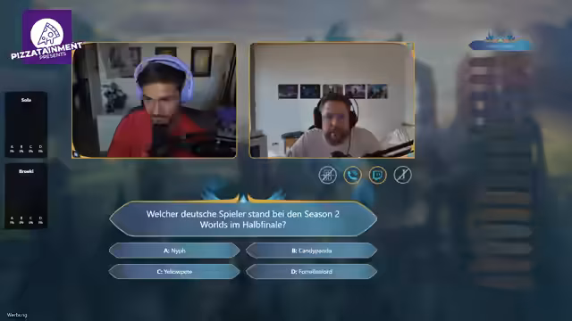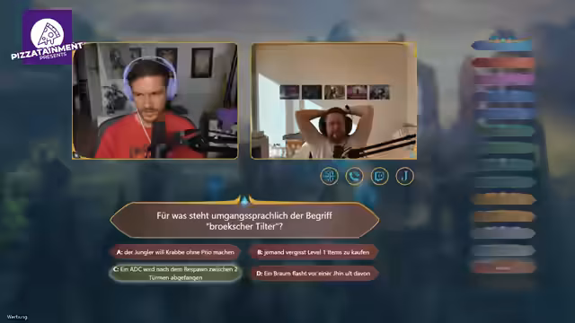 03:39:07Hauptakt des Streams ist ein Quiz, das der Streamer mit seinem Co-Streamer Broeki veranstaltet. Das Quiz hat das Thema 'League of Legends' und 'Eintracht Spandau' und nutzt das klassische Format mit steigenden Elo-Rängen von Iron bis Challenger. Unterstützt durch verschiedene Joker, versucht Broeki, so viele Fragen wie möglich zu beantworten. Fragen drehen sich um LoL-Terminologie, Spandau-Hymne und Champion-Details. Der Streamer moderiert das Quiz und unterhält das Publikum.