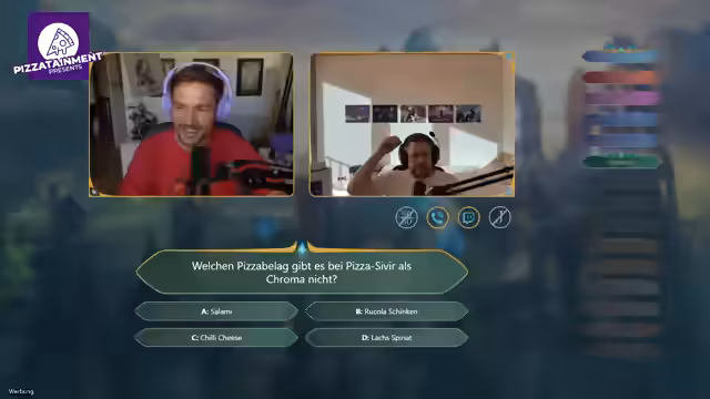 04:26:05Für die Master-Frage wird der Kandidat gefragt, wie Corkis Champion-Titel auf Deutsch lautet. Nach einer kurzen Überlegung wird 'der kühne Bombenschütze' als korrekte Antwort identifiziert. Die darauffolgende Emerald-Frage ist eine Fangfrage bezüglich eines Sponsors. Es wird nach einem Pizza-Belag gefragt, der nicht als Chroma bei Pizza Silvia existiert. Die korrekte Antwort ist Chili Cheese, da dieser Belag exklusiv bei Pizzertainment verfügbar ist.