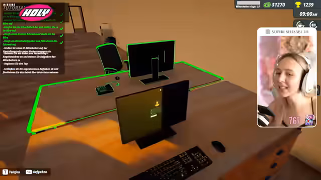05:11:35Die Streamerin beginnt mit der Gründung ihres eigenen Unternehmens in einem neuen Büro. Der Fokus liegt auf der anfänglichen Einrichtung: Es werden Kaffeemaschine, Drucker, Schreibtisch, Schränke und weiterer Bürobedarf beschafft. Die Einrichtung des Arbeitsplatzes gestaltet sich chaotisch, da Möbel wie unterschiedliche Schreibtische unpassend angeordnet werden müssen. Parallel zur Einrichtung wird der erste Mitarbeiter, eine IT-Mitarbeiterin mit dem Girl-Support-Girls-Prinzip, eingestellt.