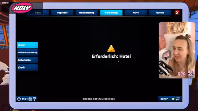 05:43:15Der Streamer wechselt zum Hotel Simulator, wo sie zuerst Holz sammelt und Zimmer vorbereitet. Sie vermietet erfolgreich Zimmer, einschließlich an Gäste aus Russland, und freut sich über zusätzliche Einnahmen. Sophia entscheidet, eine Saftlizenz zu erwerben, um das Angebot zu erweitern, während sie gleichzeitig mit technischen Herausforderungen wie vollen Warteschlangen und fehlendem Alkohol im Barbereich konfrontiert ist. Sie plant den Kauf weiterer Zimmer und verbessert die Hotelinfrastruktur schrittweise.