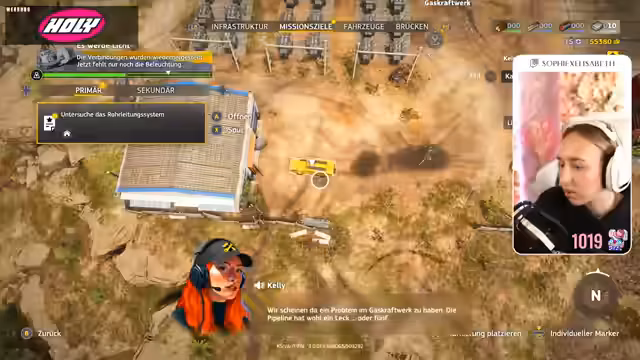 03:04:20Nach Abschluss des Straßenbaus nehmen sie die nächste Mission in Angriff. Das Ziel ist es, beschädigte Rohre eines Gaskraftwerks zu reparieren. Dafür benötigen sie Metallschrott, der in einem Recyclingwerk zu neuen Metallrohren verarbeitet wird. Die Streamerinnen beschließen, die Aufgaben aufzuteilen, während sie gleichzeitig die ersten beiden beschädigten Rohre auf der Karte lokalisieren.
