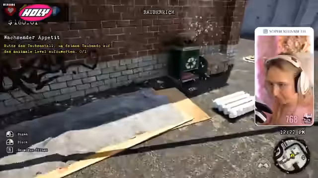 02:21:08Nach der erfolgreichen Hauptmission geht die Streamerin dazu über, sinnlose und lustige Nebenaufgaben zu erfüllen, die den skurrilen Alltag eines Obdachlosen widerspiegeln. Dazu gehört das „Begrenzte Suchen“ auf einem Steg und die Absolvierung der „15-Fahrer-Challenge", bei der sie mit dem Einkaufswagen 15 Passanten umfahren muss. Die Mission gelingt nur unter größten Schwierigkeiten durch die unpräzise Steuerung. Die Streamerin unterhält sich mit dem Chat über Tastenbelegungen und macht sich über die Absurdheit lustig, einen Polizisten den Mittelfinger zu zeigen.