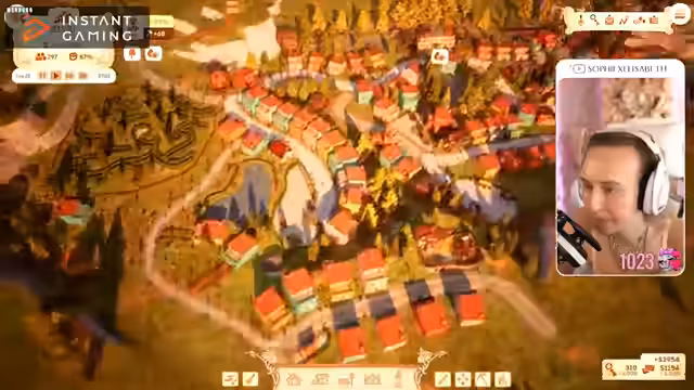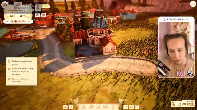 01:35:43Bei der ersten Partie Town to City baut die Streamerin eine kleine Stadt mit Häusern, Marktständen und Lagerhallen. Die Einwohner, die aus dem Chat stammen, wechseln jedoch ständig ihre Identitäten, was den Spielspaß beeinträchtigt. Trotzdem macht sie weiter, dekoriert ihre Stadt und baut Forschungszentren, während sie parallel Unterstützer dankt und den LVM Gaming Pass bewirbt.