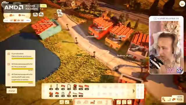 04:11:33Der Stream beginnt mit der Gestaltung einer idyllischen Kleinstadt in einem Aufbauspiel. Die Streamerin baute verschiedene Gebäude wie ein Bistro, ein Bekleidungsgeschäft und eine Wäscherei. Sie achtete auf eine ansprechende Gestaltung mit Bänken, Bäumen und Blumen. Dabei stellte sie fest, dass sie einige Häuser freischalten konnte und damit ihre Stadt erweitert. Sie diskutierte mit der Community über verschiedene Gestaltungsmöglichkeiten und experimentierte mit der Platzierung von Gebäuden und Dekorationen, um die Zufriedenheit der virtuellen Bewohner zu erhöhen.