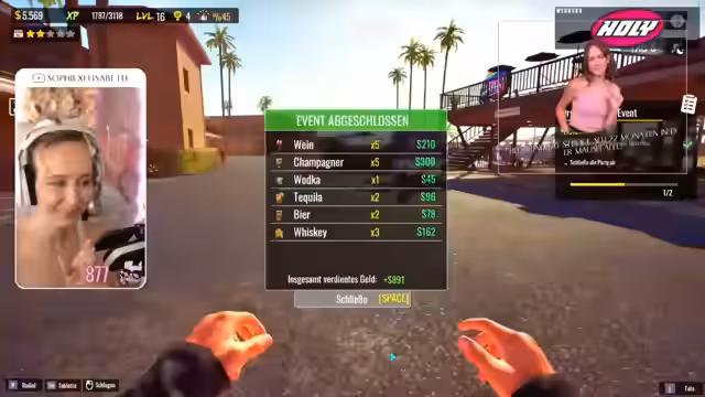 04:40:08Es wird eine Halloween-Poolparty gestartet, die als Event im Spiel dient. Die Streamerin muss die Party über das Tablet managen und verschiedene Aufgaben erfüllen, wie das Bereitstellen von Getränken und das Beantworten der Wünsche der Gäste. Das Event erweist sich als sehr stressig, da parallel zur Party weiterhin die normale Motelbetreuung, wie die Bewältigung von Kochbestellungen und Reinigungsarbeiten, gewährleistet werden muss, was zu einem hohen Arbeitsaufkommen führt.