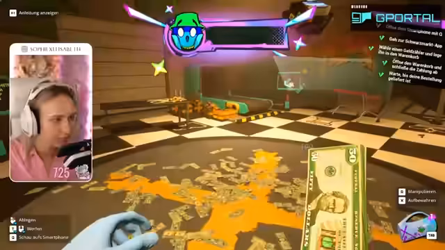 03:25:12Zuerst werden neue Produkte freigeschaltet, was die Streamerin positiv aufnimmt. Es taucht eine Nachricht von 'Betty' auf, die zu Stimmungsschwankungen führt. Später wird eine Bestellung von 'Big Boss' mit 45.000 Dollar und eine weitere mit 5.000 Dollar angenommen. Der Versuch, 5.000 Dollar in Scheinen zu bündeln und in eine Kiste zu laden, scheitert zunächst an Unklarheiten bei der Bedienung des Geldzählers und der Maschine, die Scheine auf den Boden wirft und nicht die richtige Anzahl produziert.