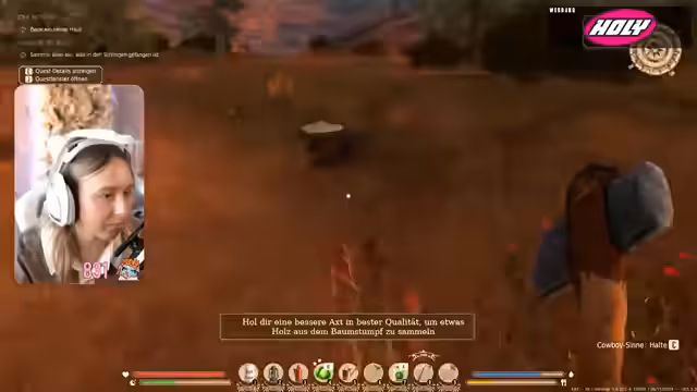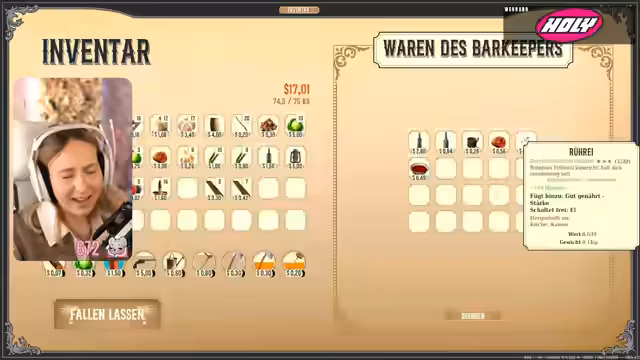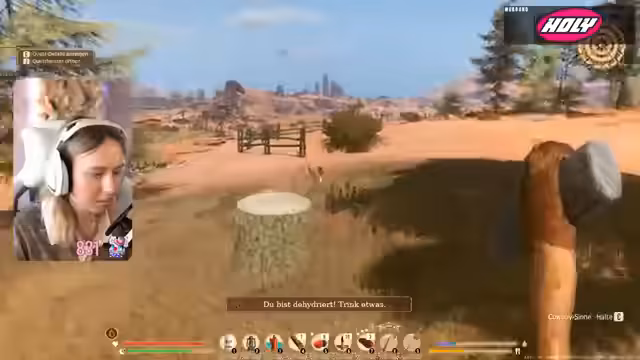 03:16:46Die Spielerin setzt ihre Erkundung fort, läuft zum Viehmarkt und entdeckt dabei ein Lagerhaus, in dem sie eine Axt und Eisenerz findet. Auf dem Weg dorthin wird sie von Aaron für elf Monate Resub und von Tui für 25 Streams in Folge unterstützt. Sie stellt fest, dass sie ihre Feldflasche immer wieder auffüllen muss, da das Wasser schnell zur Neige geht. Nachdem sie kein Wasser in der Nähe findet und ihre Farm 600 Kilometer entfernt ist, muss sie Alkohol trinken, um nicht zu sterben. Sie bedauert, das Pferd nicht gekauft zu haben, um die langen Wege zu verkürzen. Die Dunkelheit bricht herein, und sie muss dringend nach Hause, um zu schlafen. Auf dem Rückweg füllt sie ihre Gießkanne mit Wasser auf, was sich als ihre Feldflasche entpuppt.