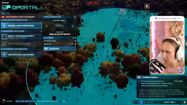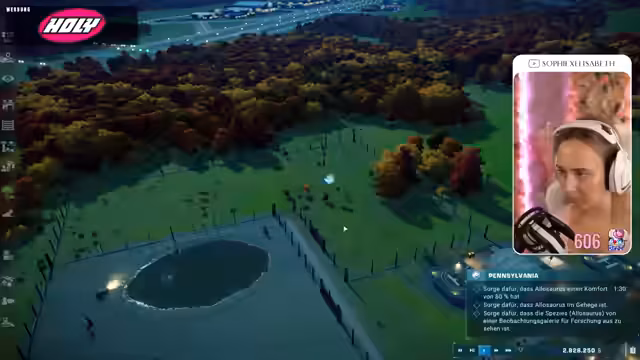 01:12:37In diesem Abschnitt beschäftigt sich die Streamerin mit dem Management der Saurier in ihrer Parkanlage. Sie berichtet über die Situation wütender Saurier, die frei herumlaufen, und plant, diese vom Helikopter aus zu betäuben und zurück in die Einrichtung zu bringen. Sie entscheidet sich dafür, einen Triceratops zuerst zu betäuben und stellt fest, dass sie ein Gehege bauen muss, bevor sie das Tier betäubt. Dabei stehen ihr diverse Zäune und Tore zur Verfügung, die sie strategisch platzieren muss, um die Tiere sicher zu halten und zu transportieren.
