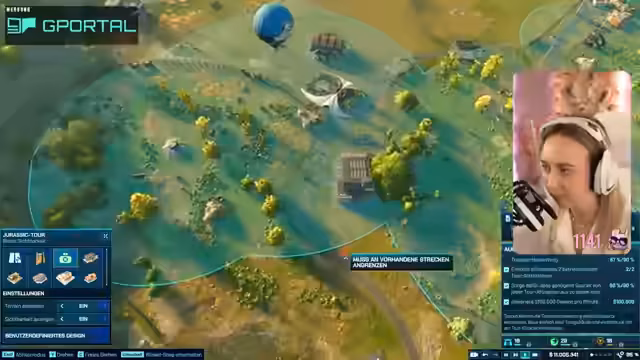 06:28:29Um die Transportbewertung des Parks zu verbessern, die nach wie vor niedrig ist, werden neue Attraktionen gebaut. Die Streamerin entscheidet sich für eine Ballon-Tour und eine Einschienenbahn. Dabei stößt sie auf bauliche Einschränkungen; Touren können beispielsweise nur durch ein einzelnes Gehege führen und nicht durch Wasser. Gleichzeitig wird der Unterhaltungsruf durch den Zukauf neuer Dinos erhöht und es werden Photopunkte eingerichtet, um die Besucherzufriedenheit zu steigern.