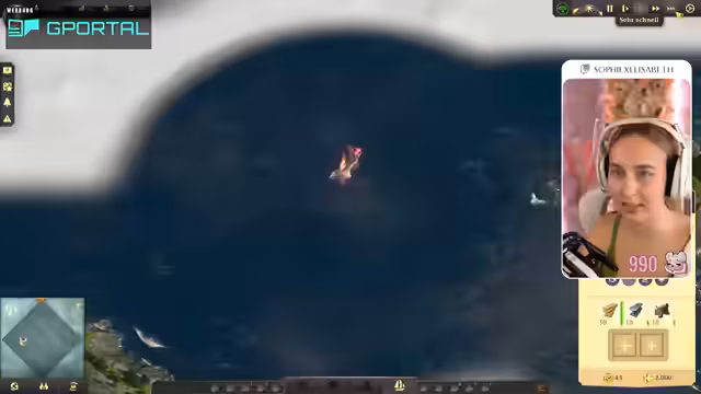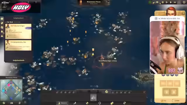 02:23:49Ein zentraler Punkt des Spiels wird die Seefahrt und der Handel. Die Streamerin nutzt ihr Schiff, um Aufgaben von anderen Fraktionen anzunehmen und Ressourcen zu handeln. Ein wichtiges Ereignis ist das Anlaufen eines Kriegsschiffs, welches sie mit Hilfe des Geleitschutzes abwehren muss. Sie muss dabei logistische Entscheidungen treffen, wie beispielsweise den Bau von Silos zur Produktivitätssteigerung in der Viehzucht und die Anbindung an ein Lagerhaus für effizienten Handel.