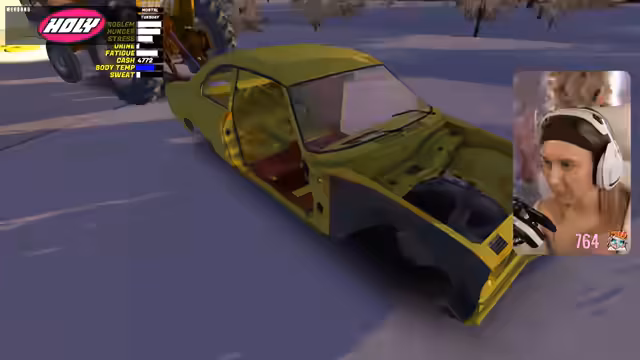 05:28:25Die Streamerin erreicht die Werkstatt und muss nun das beschädigte Auto mit dem Traktor abschleppen. Nach einigem Zögern und Fehlversuchen gelingt es ihr, das Seil anzubringen und das Fahrzeug zu bewegen. Während der Fahrt mit dem lauten Traktor wird die Musik übertönt, was die Herausforderung für sie noch größer macht, da sie sich im Spiel kaum orientieren kann.