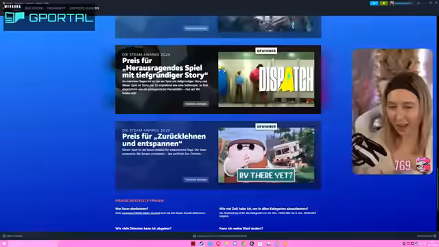 01:32:43Nachdem das Thema Finanzen vertieft wurde, wechselt sie das Thema zu den Steam Awards 2025. Viele der nominierten Spiele sind ihr nicht bekannt oder hat sie nicht gespielt. Sie zeigt sich erstaunt, dass 'Silksong' Spiel des Jahres wurde und nicht 'Expedition 33'. Besonders positiv hebt sie 'Dispatch' hervor, das für sie das beste Spiel des Jahres ist und das den Preis für die beste Story gewonnen hat. Die von ihr gefundene Unterschiedlichkeit der Steam Awards im Vergleich zu anderen Preisverleihungen, die nicht von den großen Studios dominiert sind, findet sie spannend und erfrischend.