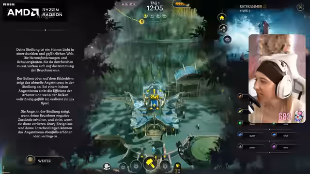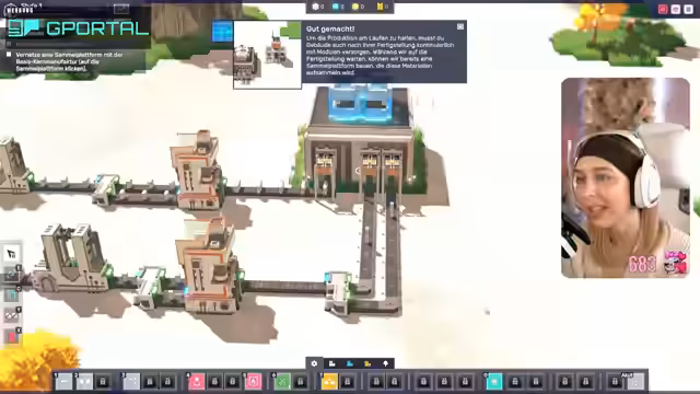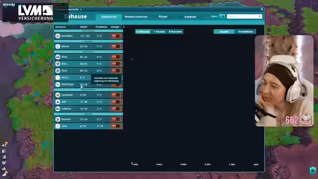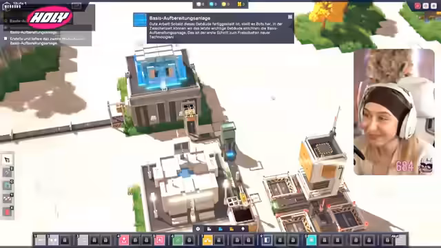 01:59:29Während des Spiels stieß die Streamerin auf mehrere technische und mechanische Hürden, die den Bauvorhaben behinderten. So kam es zu einem Absturz des Weltraumwals nach dem Versuch, ein Funksignal zu senden, und sie konnte die Sägemühle nicht sofort freischalten, obwohl die scheinbaren Voraussetzungen erfüllt waren. Die Benutzeroberfläche wurde als teilweise verwirrend beschrieben, insbesondere das sechseckige Raster für den Straßenbau, das das Platzieren von Gebäuden und Wegen erschwerte und zu unlogischen Produktionswegen führte.