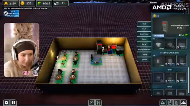05:15:37Aufgrund der hohen Komplexität von Modulus wechselt die Streamerin zu einer neuen Demo: Service Please, ein Restaurant-Simulationsspiel. Nachdem sie im Stream bemerkt, dass ein User den Stream-Titel nicht beachtet, unterbricht sie kurz das Gameplay, um die Missachtung der Thematik anzusprechen. Die Community stimmt für Service Please und das Spiel beginnt mit einem Tutorial, bei dem das erste Restaurant eingerichtet wird, inklusive Personal, Küchen设备和设计. Sie ist erleichtert, dass das Spiel simpler ist und wieder zum Sprechen kommen kann.