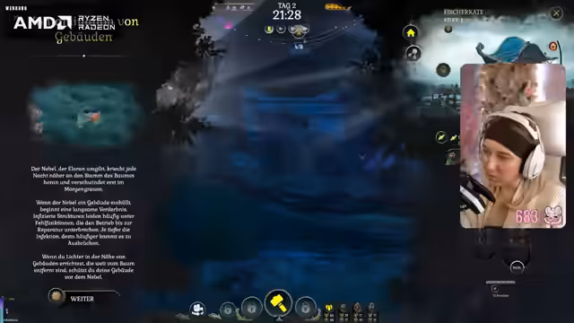 01:39:20Nach dem Einstieg in das Spiel stand der Ausbau der Siedlung im Vordergrund. Es wurden Gebäude wie Holzfäller, Erzschmelzhütten und Werkzeugschmieden errichtet, um Ressourcen wie Holz, Eisen und Werkzeuge zu gewinnen. Ein komplexes System aus Perkpunkten ermöglichte das Freischalten von Verbesserungen und Fähigkeiten, um die Siedlungseffizienz zu steigern. Besondere Herausforderungen waren die Versorgung der Gebäude mit Strom durch platzierungsnahen Generatoren und die Steuerung der Nachfrage und Produktion von Gütern, um die Bevölkerung zufriedenzustellen.