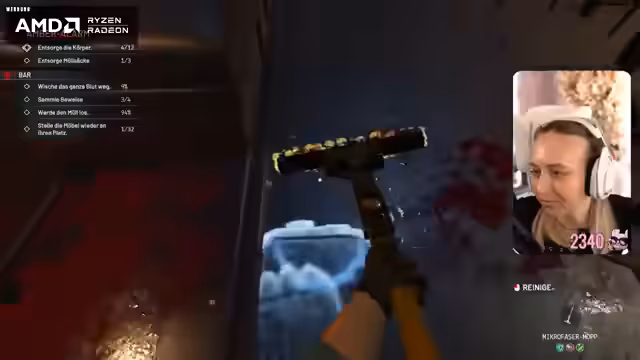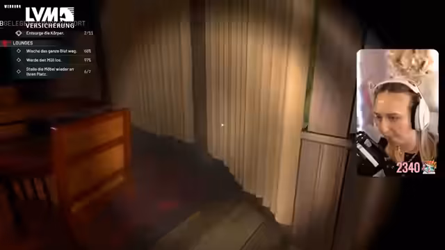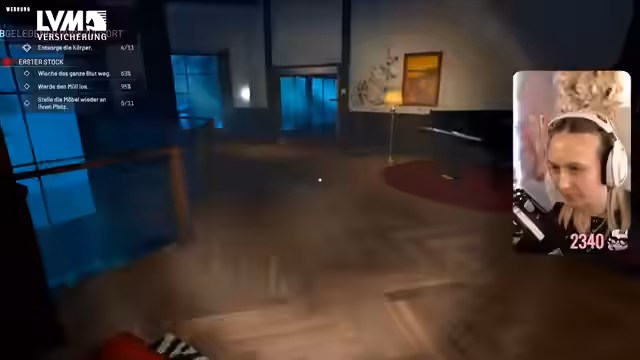 08:15:01Der Fokus liegt auf der gründlichen Reinigung der Villa. Die Streamerin sammelt Beweise wie eine Kassette, reinigt Autos mit einem Dreizack und benutzt den Hochdruckreiniger. Sie interagiert mit verschiedenen Objekten wie einem Sarg, der als Bücherregal dient, und findet ein Rezept für Vampir-Diamantzähne des Senators, das ihren Fortschritt dokumentiert.