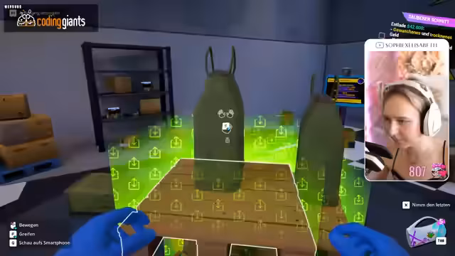03:20:29Die Spielszene wird durch ständige Lecks aus dem Einkaufswagen und die Performance-Last der Geldzählmaschine beeinflusst. Die Streamerin versucht, die Ordnung durch das Aufstellen von Paletten zu verbessern, um Gegenstände zu lagern. Sie bemerkt, dass die Unordnung im Spiel die Performance negativ beeinflusst und überlegt, wie sie das Chaos am besten managen kann, ohne den Spielfluss zu unterbrechen.