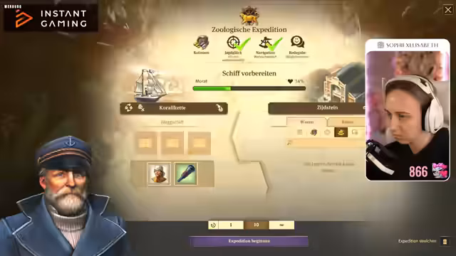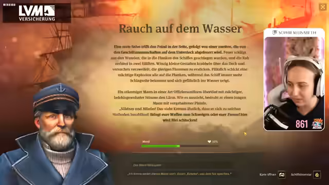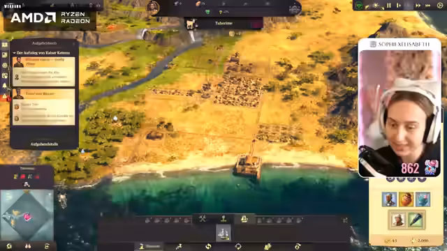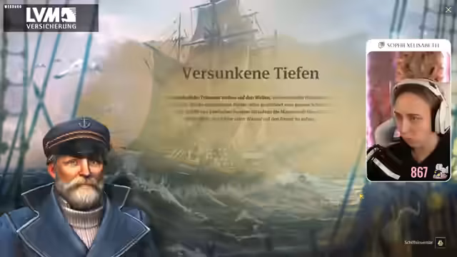 01:56:04Die Protagonistin erkundet ein Plateau in Sile Amidos und untersucht Ruinen. Sie trifft auf einen Fremden, dem sie sich ehrfürchtig nähert. Sie gibt an, durch das Schicksal gestrandet zu sein und als Händler zu kommen. Sie erwähnt ein altes Artefakt, das sie an diese Küste geführt hat. Sie entdeckt eine Belohnung, hat aber keinen Platz mehr dafür und wirft Bier über Bord. Sie benötigt Baumwolle für Pelzmäntel. Sie überlegt, wie sie ihr Konstrukt weiterbauen soll und nimmt eine Lieferaufgabe für Stahlträger an. Sie plant, die Wege auszubauen und Steinstraßen zu bauen, um den Transport zu beschleunigen. Sie erwähnt einen entspannten Cozy-Montag-Stream und plant einen Zweitkanal, auf dem sie Spiele spielt, auf die sie Lust hat. Sie bedankt sich für Resubs und Follows. Das Schiff wird angegriffen. Die Protagonistin versucht, den Rumpf zu zertrümmern und die Take-Lage mit Kettenschüssen zu befeuern. Ein Offizier bedroht einen jungen Mann mit einer Pistole. Die Protagonistin gibt an, den Mann nicht zu kennen und lehnt ein Freikaufen ab.