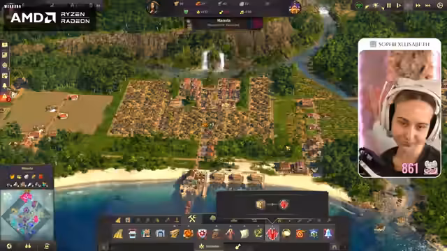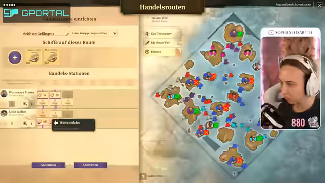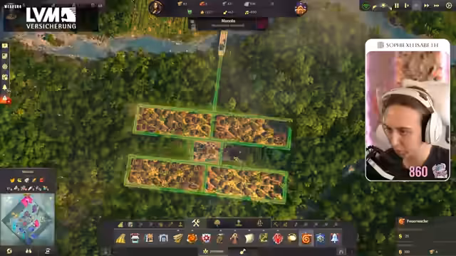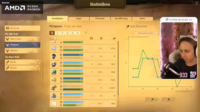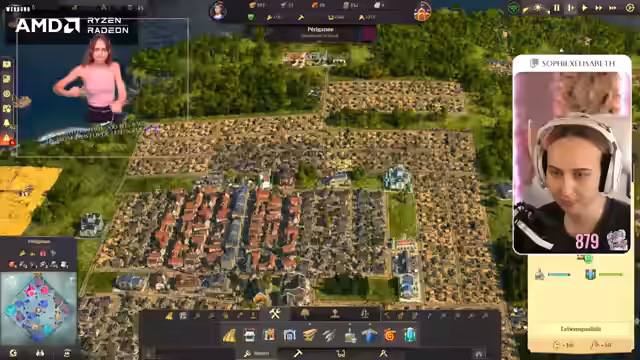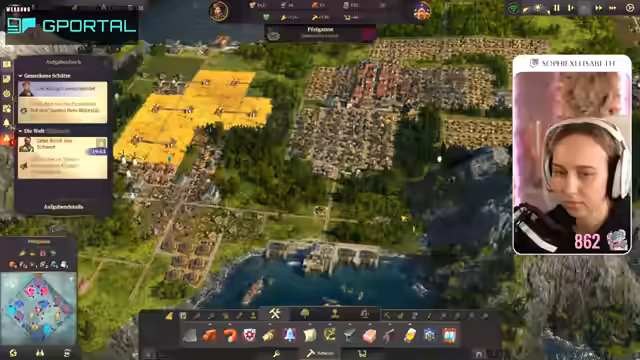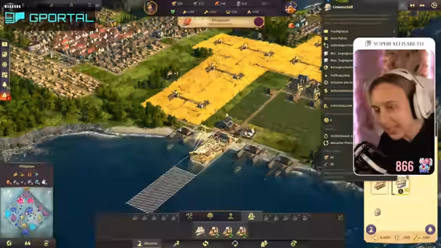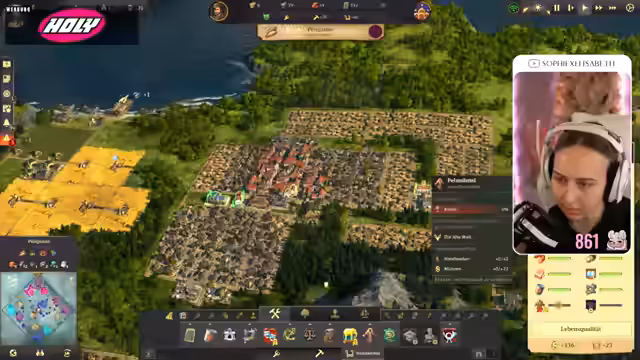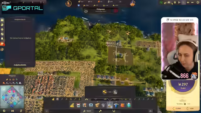00:49:00Die Streamerin überlegt, ob sie auch Offstream Anno weiterspielen soll. Sie kehrt zu ihrer Stadt zurück, die sie zuletzt gebaut hat. Sie findet es krass, dass ihr die bebaute Fläche kleiner vorkommt als in der Demo von Anno 1800, die sie am Freitag gespielt hat, obwohl sie trotzdem eine Vielzahl an Bevölkerung hat. Sie stellt fest, dass ihr Holz fehlt und muss erstmal wieder reinkommen. Sie erinnert sich, dass sie sogar zwei Inseln besiedelt hat und dass sie Paprika und Seife hin und her bringt. Sie muss langsam mal schauen, wie sie die Piraten in den Griff bekommt, die mittig auf der Karte sind. Sie überlegt, ob sie schon mal in die neue Welt aufbrechen soll und startet eine Expedition in Richtung Land der Löwen. Sie packt ein bisschen Brot ein und stellt fest, dass sie für Redegabe ein Item mitgeben muss. Sie findet heraus, dass Bier Redegabe bringt und startet die Expedition. Sie geht erstmal nach Embessa. Sie sucht nach einer Übersicht, wie viel sie von was hat und findet diese mit der Taste Steuerung W. Sie stellt fest, dass sie eine höhere Nachfrage nach Wurst und Brot hat als eine Versorgung.